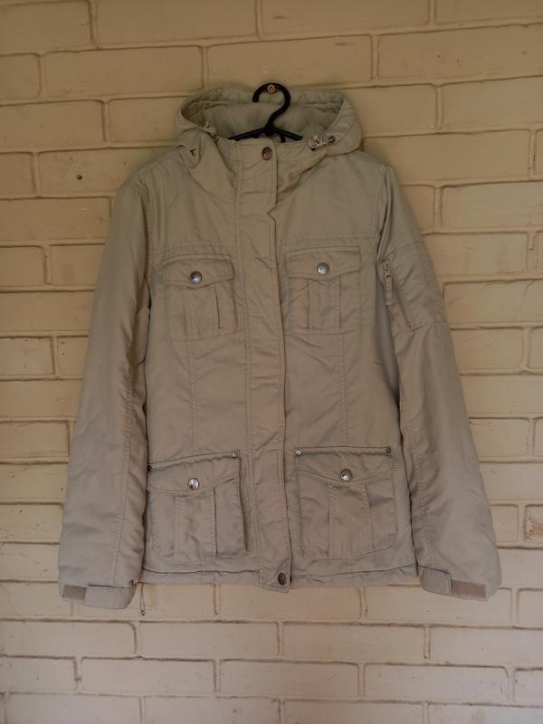ПОГ 53 длина 67 см Куртка теплая, внутри утеплена флисом дополнительно, сезон холодная осень-зима. Единственный нюанс - 3 фото- загрязнение возле левой подмышки сзади.