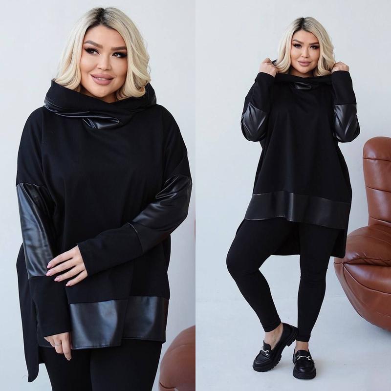 Крута новинка Туника свободного кроя с удлиненной спинкой и вставками из эко-кожи. Капюшон декорирован рабочей молнией! Очень стильная, выполненная в стиле спорт шик. Крой оверсайз! Мод.241 инспиро Размер: универсальный 50-56 Ткань: итальянский трикотаж +еко кожа Очень хорошее качество ткани На моделе 50-56 размер Параметры модели: ОГ 110 об 115 длина спереди – 74 см; • длина сзади – 90 см; • длина рукава 72 см.ск3.Не надавливайте на кнопку Купит, технические проблемы подписывайтесь..ждю)