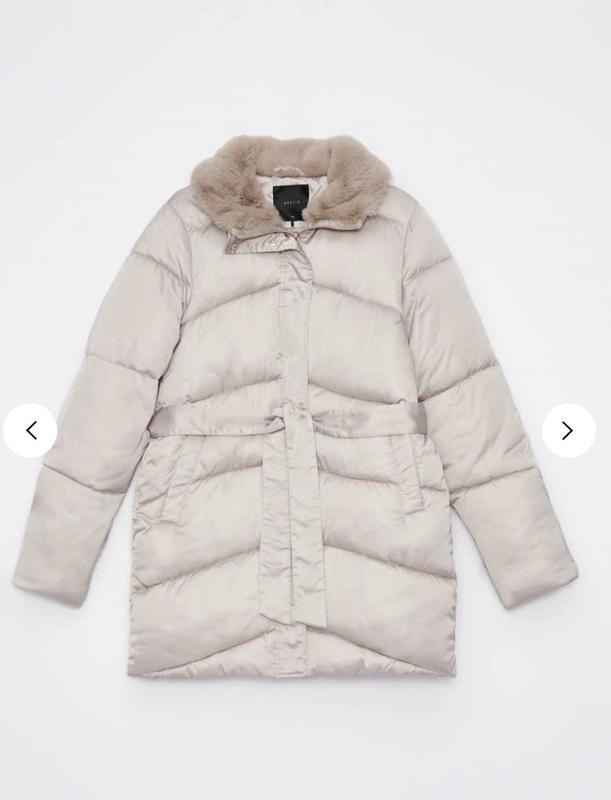Стьобана куртка-пальто бренду mohito з хутровим комірцем та поясом. застібка на блискавку і кнопки високий комір дві бокові кишені Розмір 38 Колір сіро-перламутровий Нова, з біркою