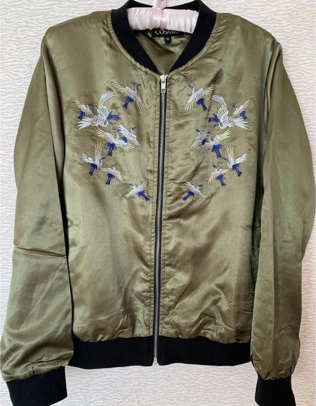 Крутой бомбер цвета хакки с вышивкой, размер 14 (L), есть небольшой дефект- На левой руке внутри немного перекручена подкладка, это заводской брак, в носке практически не заметен