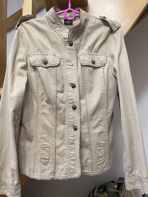 В куртці відсутній ґудзик , фото додала. Легка куртка в бежевому кольорі з вишивкою на спині