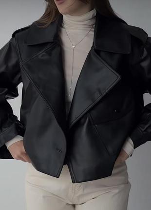 Косуха з гладкої матової екошкіри, є підклад, металлева фурнітура, усі кармашки та кнопки робочі Розмір м Напівобхват грудей 54 см, довжина рукава від горловини 71 см, довжина самої куртки 47 см