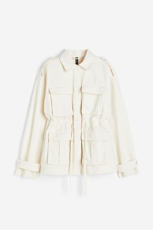 курточка Н&М молочного цвета размер Л, можно пробовать XL Ширина в груди 56,ширина под рукавами 62 Ширина в талии 59 (не стянуто) Рукав от горловины 78 Длина по спинке 70