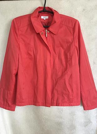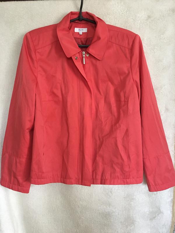 Легка укорочена куртка-піджак. Ширина в плечах-42см, в грудях-54см, ширина по низу- 57, довжина рукава 57 (його можна підвернути-красива підкладка), довжина по спинці 57см. Є дві кишені, застібка-змійка і вверху на кнопці