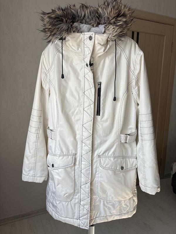 Без дефектів на сінтопоні розмір 48/50 По спинці 86 см Довжина рукава 64 + плече 14 см Полу обхват по груді 62 см