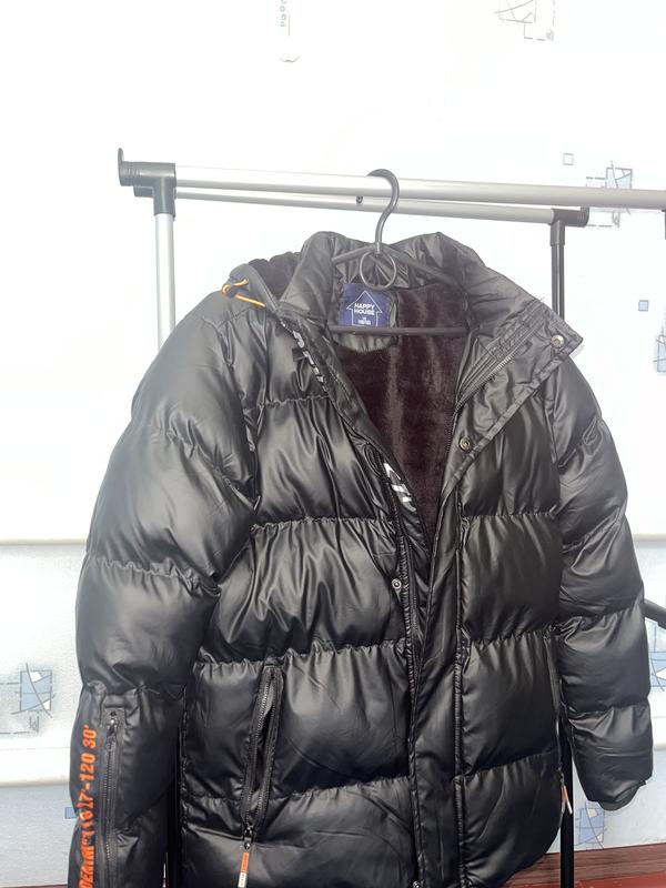Зимняя куртка, на молнии и кнопках (немое одной кнопки). 2 кармана, с капюшоном (дстегивается).