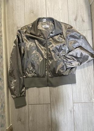 Серебристый бомбер из атласной ткани, имеет качественную металлическую фурнитур, цельный.