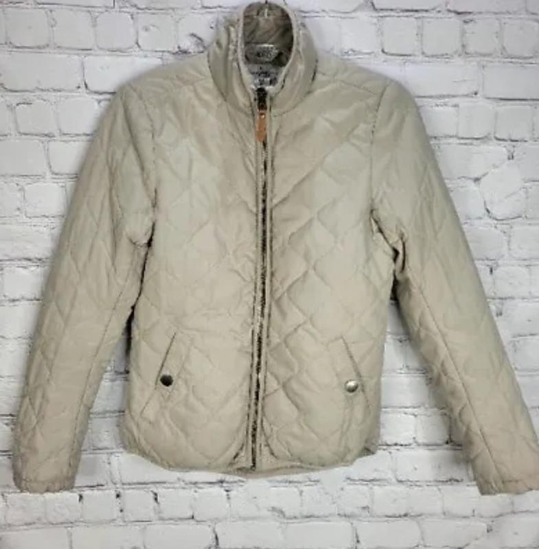 Куртка H&M женская на теплую весну, размер S, цвет слоновой кости, стеганая, очень классно смотрится. Стан идеален, без дефектов. Замер: полуобхват груди 45см, рукав 61см, длина перед 56см, сзади немного удлиненная 60см.