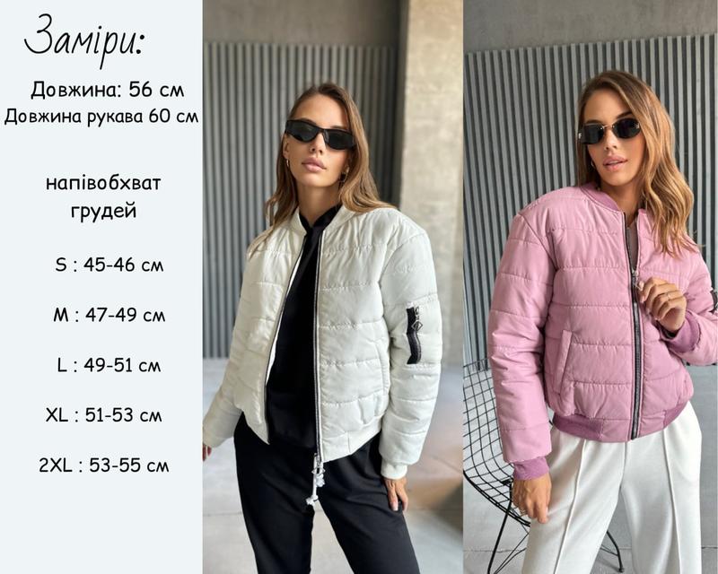 pani:482 Цвет: белый,черный, розовый, бежевый Размеры: S, М, L, XL, 2XL Ткань: плащевка EMI+200-й силикон Описание: Очень теплый и стильный бомбер из качественной водоотталкивающей и ветронепродуваемой плащевки EMI, наполнитель силикон 200. Бомбер имеет два боковых кармана и декоративный на рукаве. Горловина, манжеты и низ - турецкая меловая. (Заміри вказані на параметри)
