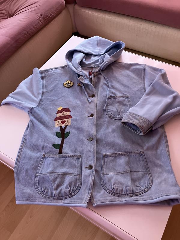 Продається дуже гарна джинсовка на ґудзиках, з карманами, з аплікацією, рукава та капюшон мʼякі, на флісі, до неї йдуть теплі спортивні штани з карманами, на резинці, виглядає дуже класно