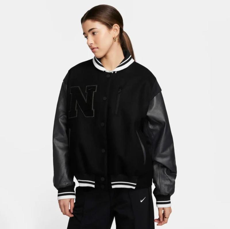 Крутэцкий бомбер Nike в наличии. Шерстяной верх с кожаными рукавами. Продуманные детали делают классический университетский жакет незабываемым и современным. Шерсть, кожа и атлас сочетаются для создания премиального вида, а оверсайз дизайн позволяет легко накладывать слои. В то же время изогнутый задний край обеспечивает обновленную посадку, которая формирует вашу спину. FZ5733-010