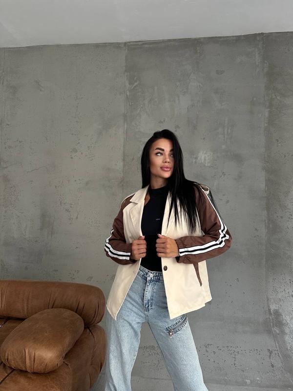 ⬆️ФОТО⬆️ Куртка-блейзер Мод 186 дн📍виробник Одеса Виріб на підкладці , має дві кишені, застібається на ґудзик . На спинці накатка , та по низу манжет з рибани . Рукава оздоблені декоративною лампасною стрічкою . ◽️розміри :1(42-44);2(46;48) ◽️тканина : коттон -меморі +підклад + рибана ◽️колір : чорний + т.беж Шоколад + крем ◽️заміри 1(42-44)-ОГ-100 2(46-48)-ОГ-105 Довжина по спинці -65 Довжина рукава від горлов. -73 ФОТО РЕАЛ 🛒ВІДПРАВКА протягом 3-7 робочих днів‼️ 950 грн 💌НАПИСАТИ МЕНЕДЖЕРУ 🔖УМОВИ ЗАМОВЛЕННЯ
