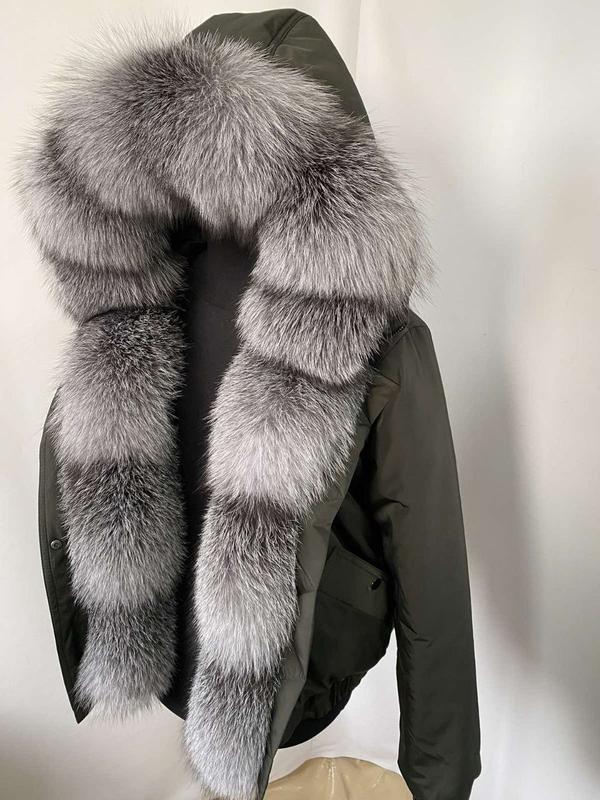 Куртка хаки зимняя женская, бомбер с натуральным мехом блюфрост в серебристой расцветке. р...