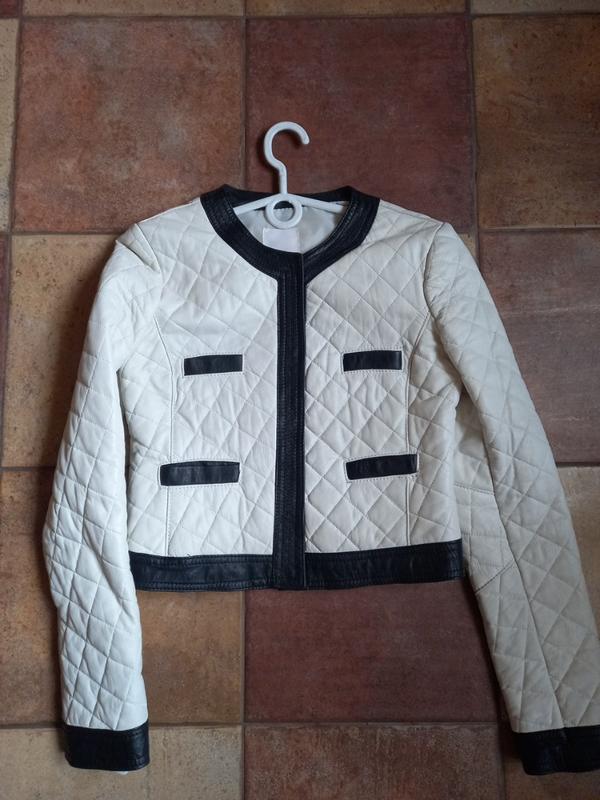 Белая,короткая кожаная куртка, длина 48см,плечи 39см,пог 43см, низ полуобхват 44см.