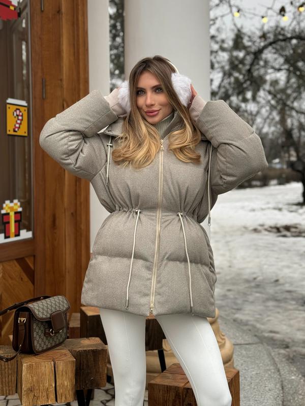 Пуховик кашемір на кулісці Неймовірний крій, зручний рукав з манжетами, куліса з регулятором та капюшон на блискавці Найкращим його роблять ще декілька деталей: Має внутрішній карман на блискавці та бокові кармани ззовні також з блискавкою Розмір один: 42/46 Кольори: сірий ,беж,шоколад Наповнювач: синтетичний пух Верхній шар - кашемір,та в середині подвійний антіпух