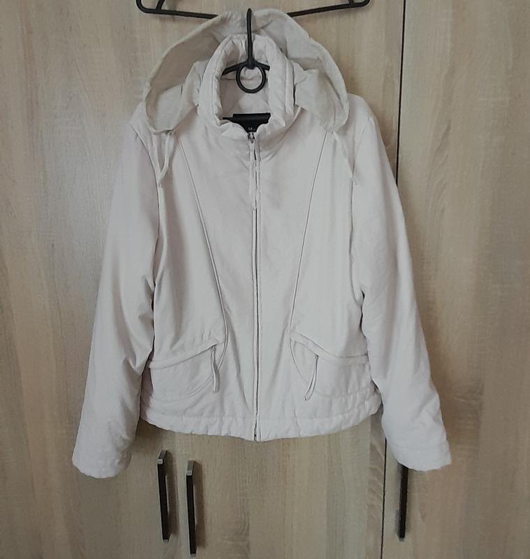 Женская куртка бело-молочного цвета, хорошего качества, капюшон можно спрятать в воротник, удобная, мягкая, в красивом состоянии, размер 48