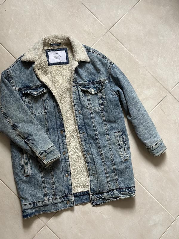 Подовжена джинсова куртка на овчині. Надзвичайно тепла, розмір С. Довжина по спині-80 см. Дефектів ніяких немає, стан ідеальний.