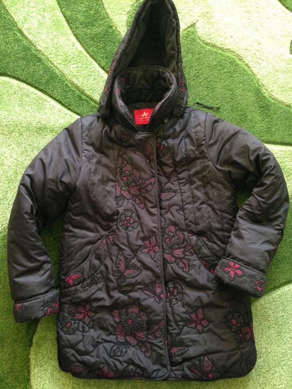 Дуже тепла курточка з капюшоном , з вишивкою та паєтками,чорного кольору.Довжина 78 см,пог-54-55см,плече-12см,довжина рукава-65см(манжет можна отварачівать)