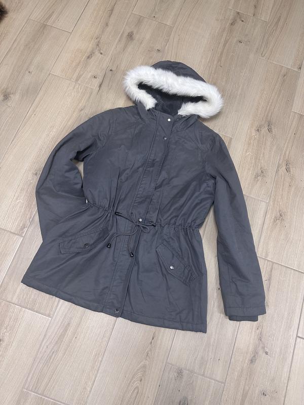 Тепла ,зручна куртка з затяжкою на поясі. Дуже приємна тканина. З штучним хутром на капюшоні. З утепленням. Без дефектів. Довжина 75см Ширина в грудях 50см Рукав 62см Відправляю будь якою зручною для Вас поштою)