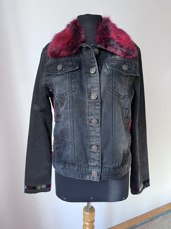 Джинсовая курточка бренда Desigual с отстегивающимся воротником искусственного меха. На курточке есть аппликация в виде разноцветных цветов. На курточке очень красивые пуговицы в форме цветов. Размер S-M. Замеры: от проймы до проймы-51 см, пот-47 см, пост-48 см, длина по спине-53 см, длина рукава-62 см.