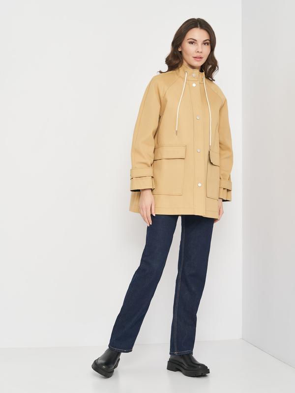 Замеры по изделию: S Обхват груди - 118 см Широкая куртка из смесового хлопка с воротником-стойкой, кулиской и кнопками спереди. Длинные широкие рукава реглан с лейблом и регулируемыми пуговицами на манжетах, накладные передние карманы с клапаном. Без подкладки.