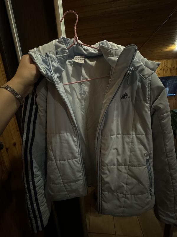 Осенняя куртка Adidas В хорошем состоянии, цвет светло голубой. Капюшон отстегивается, длина до пояса. Размер С-М. Внизу может затягиваться, чтобы сделать более узкое, сверху есть липучка.