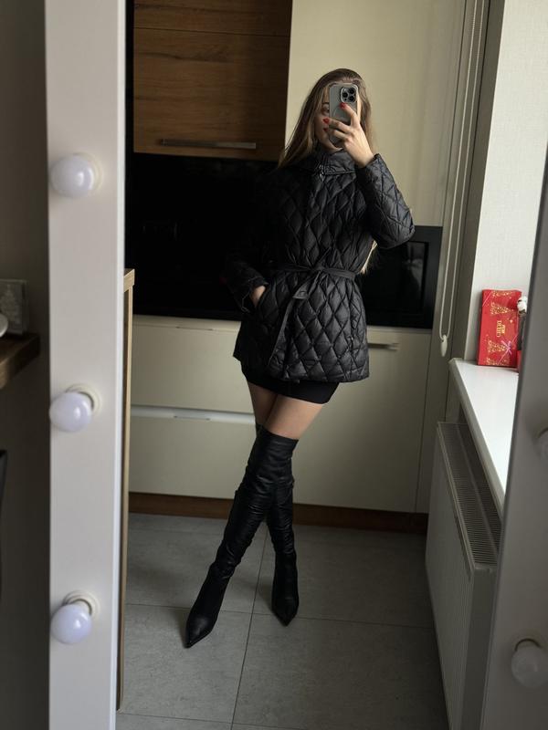 Стильная курточка с капюшоном с поясом стеганная черная размер s