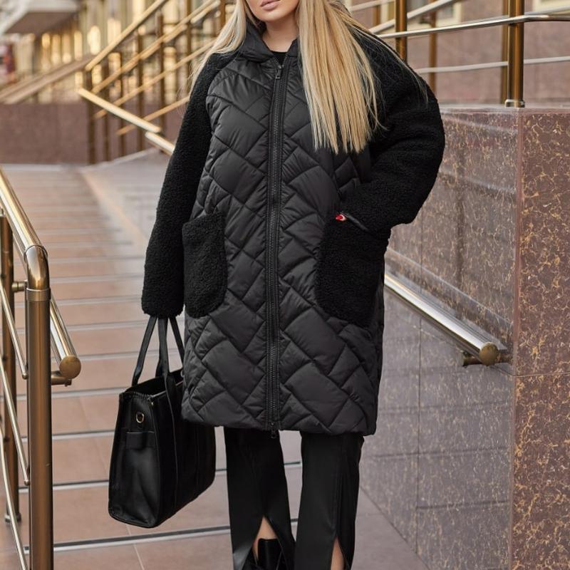 #Куртка-полупальто "Комби-барашок" Артикул: 558-5277 Цвет: черный и молочный Размер: 44-46, 48-50 Материал: стеганая плащевка, водонепроницаемая, на 150-м силиконе, с подкладкой (еврозима) Рукава, капюшон и карманы: барашик-тедди, на 80-м силиконе с подкладкой. Молния двойная, тракторная.