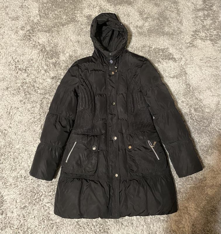 Пуховик куртка черная Длина 87 Полуобхват груди 48 Пояс 44 Бедра 55 Есть недостатки на рукавах внутрь задерто