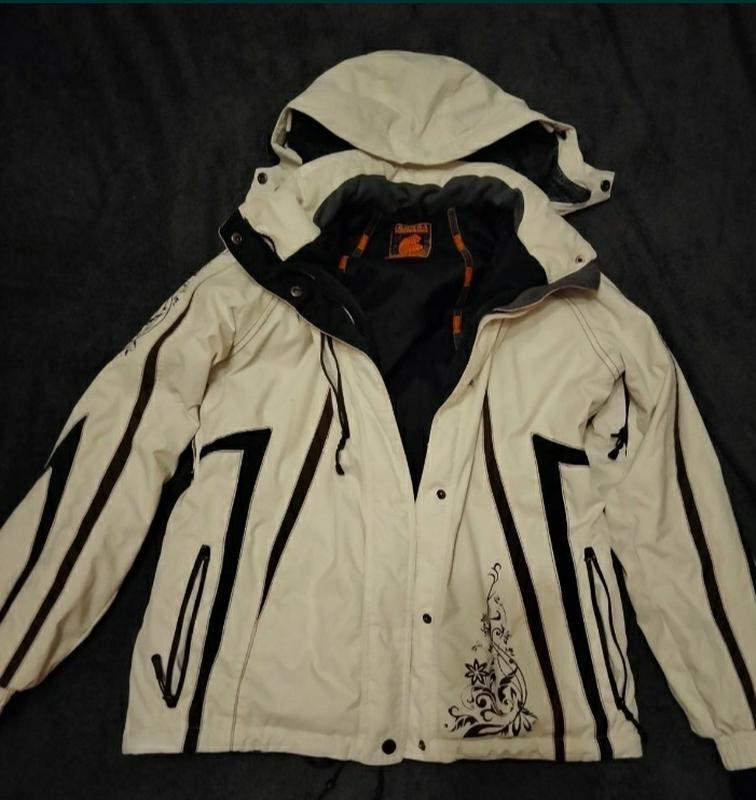 Куртка зимняя,непродувайка,белая.Гарный стан, но есть малая царапина на груди, появляется фото.Всредние карманы, резинка на застежках и утяжки.год 55см.длина 63см.