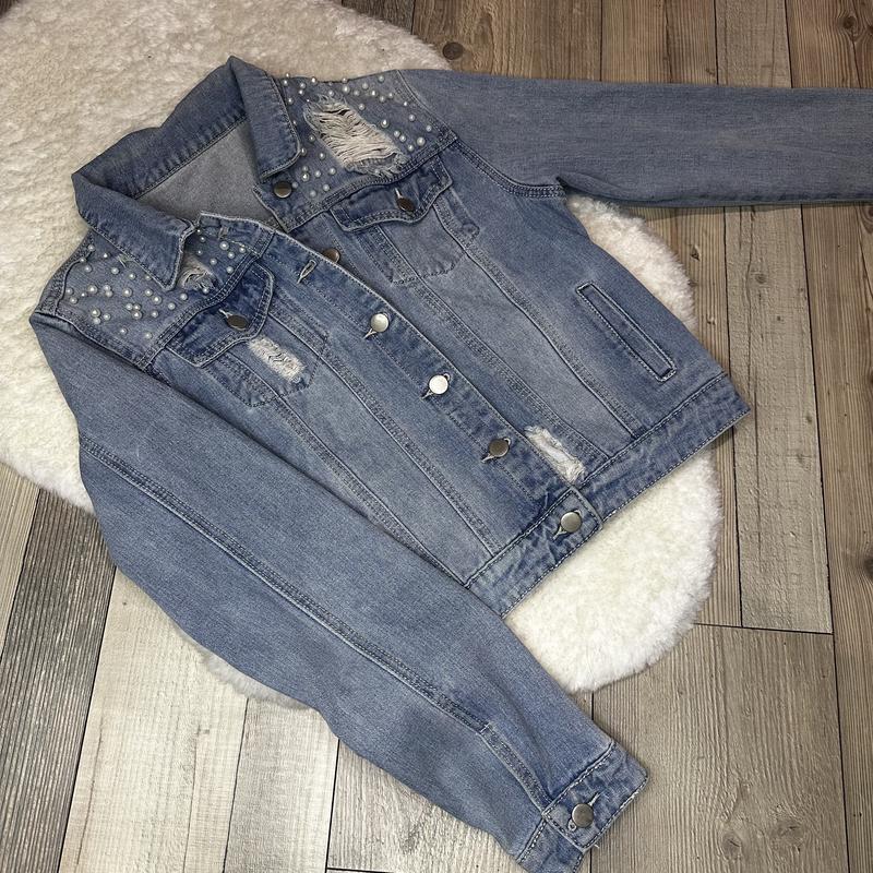 Джинсовка синего цвета с потертостями и бусинами Подойдет на s-m Длина: 50см Ширина по груди: 45