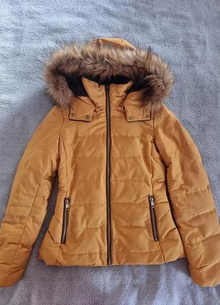 зимова куртка жовтого кольору, має кишені на блискавку, на штучному хутрі, капюшон відстібається