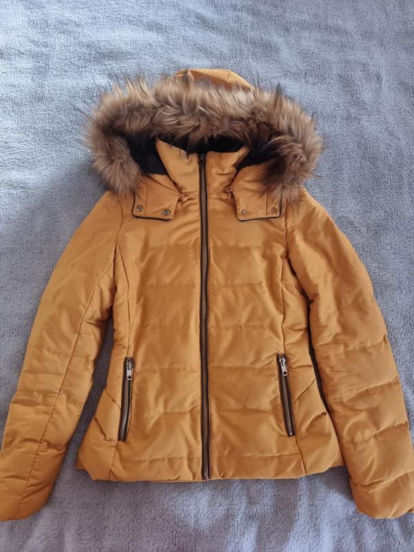 зимняя куртка желтого цвета, имеет карманы на молнию, на искусственном меху, капюшон отстегивается
