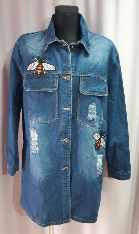Куртка джинсовая женская Olko. Цвет синий, аппликация пчела. Размер ХХL. ПОГ-56, ПОБ-58, Рукав-59, Плечи-47, Длина-84. Новая.