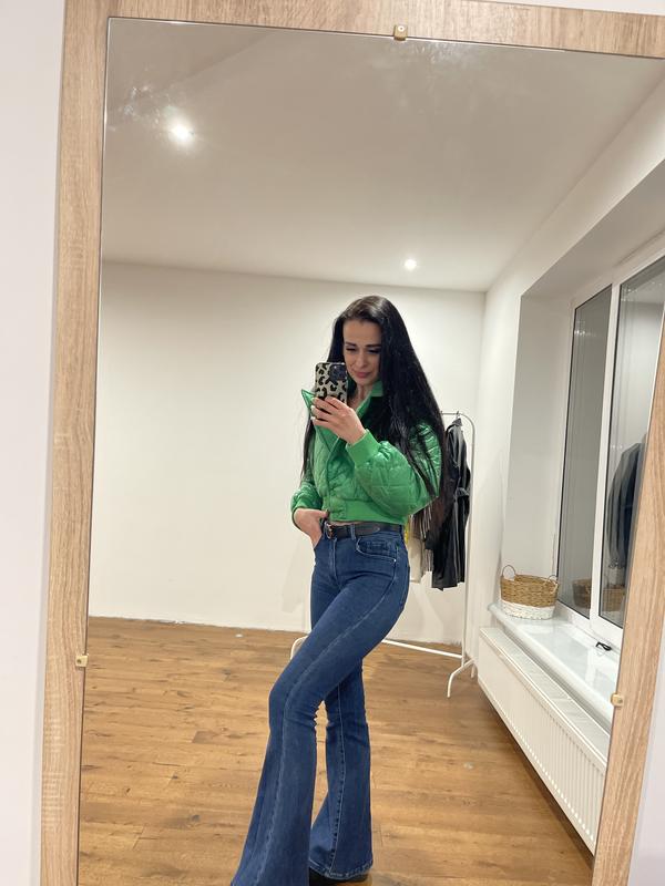 Очень красивая укороченная куртка зеленого цвета 💚 Размер : L/XL) Замеры: 🌸грудь ( пол обхват) - 60см 🌸 талия на резинке -42см, тянется до 62см 🌸длина - 49см 🌸длина рукава с плечевым швом -72см