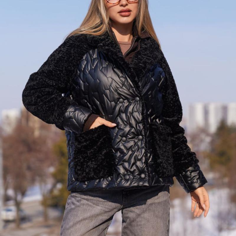 Демисезонная комбинированная куртка Модель: К-308 Размеры: 42-56 Цвета: молоко,шоколад, черный Тканина: Плащова тканина, Еко-хутро Утеплитель силикон 100 Длина 65 см Длина рукава 73 см от воротника МN