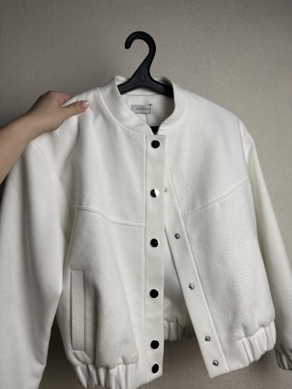 Дуже якісний новий бомбер. Купила так і ні разу не одягнула:) Розмір М. Мʼякий, теплий матеріал, не важкий. Склад: 25% вовна, 30% кашемір, 45% поліестер. Розмір білосніжний білий. Заміри: довжина по спині 53 см, рукав 56 см, ширина 53 см. Є підкладка, застібається на кнопки. Купувала за 1750 грн, зараз їх продають за 2100 грн. у цьому ж магазині.