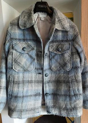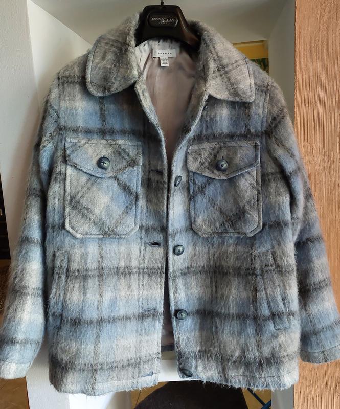 Куртка рубашка клетчатая серо голубого цвета. Ворсистая структура.. Размер указан XS, но с учётом оверсайза. Садится на рр. 46-48. Ткань: акрил, полиестер, коттон, шерсть. Плечи 43 см ПОГ 55 см Рукав 56 см Длина 68 см