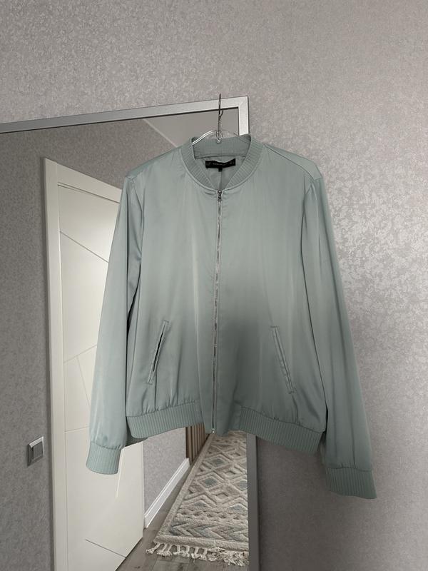 Легкий і стильний бомбер мятного кольору на підкладці. Металева фурнітура. 2 кармани. Манжети. Підійде на розмір Л Довжина 57 см ПОг 55 см Рукав від плеча 61 см