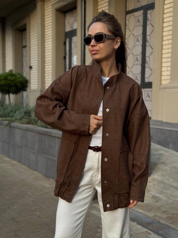🤎новинка🤎 🦾В наличии 🦾 Бомбер Арт.0495 Ткань: пальтовой кашемир на трикотажной основе Размер:42-46 Цвет: розовый, шоколад в клетку Бомбер oversize. Застегивается на кнопки. По низу манжет на резинці. Качество🔝🔥 Замеры: Рукав от воротника: 72 см Об'ем: 112см Манжет: 94 см Длина: 71 см
