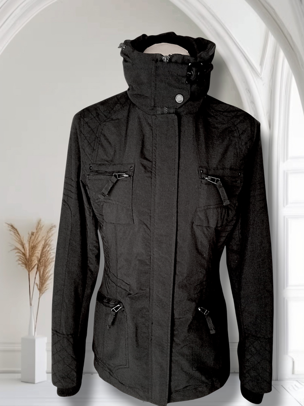 куртка женская ветровка черная прямая удлиненная на подкладке мембране сетка воротник высокая стойка со скрытыми капюшоном, по талии на шнурке, под регулируемой ширина талии ( кулиска), имеет капюшон, который прячется под молнией на воротнике, воротник двойной - один часть из плащевки, вторая из плотного трикотажа, манжеты рукавов выполнены также из плотного трикотажа, застегивается на два пластиковых молния, и включает четыре кармана впереди - две маленьких на груди и два по низу больше, достаточно вместительные, ухие застегиваются на молния.Куртка изготовлена из качественного водонепроницаемого материала средней плотности, благодаря подкладке ( мелкая сетка), хорошо держит температуру тела, практически не пропускает влагу и ветер, идеально на прохладную дождливую погоду,Стан идеален без Всех дефектов.Размер указан 8(36), то есть подойдет на S, идеально по всему размеру,( фото на манекене размера S), можно на XS, будет немного более свободно садиться. Производство популярного британского бренда Next. Замеры Плечи 36 см Рукав от плеча 65 см (вместе с манжетой) Ширина рукава понизу 9 см Пройма 23 см Расстояние между подмышками 45 см В груди 45 см Талия 42 см/ регулируется Бедра 48 см Ширина понизу 49 см Длина изделия от плеча до низа 65 см Высота воротника 10 см