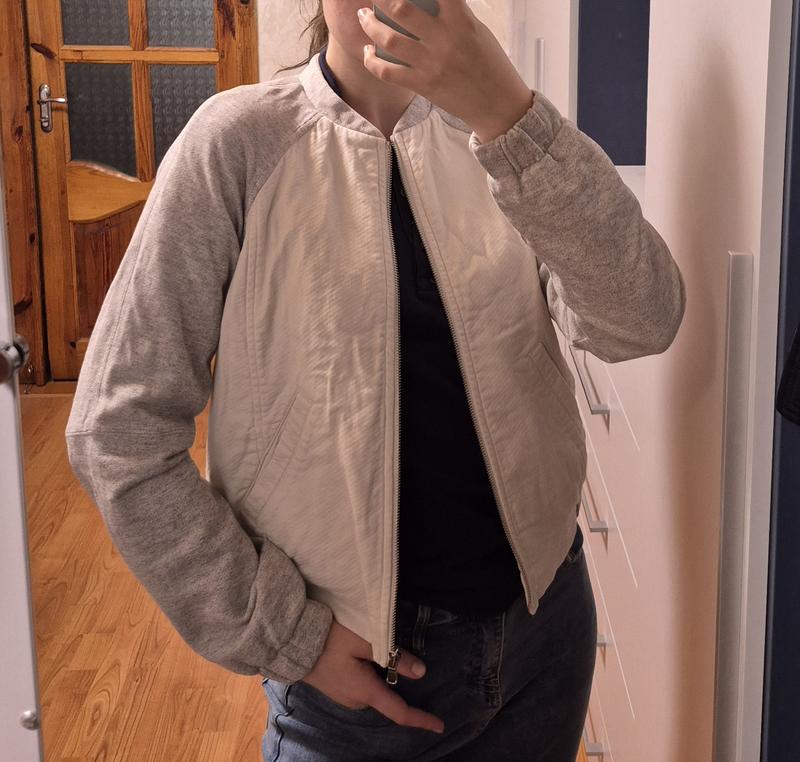Стильный легкий бомбер от бренда Loft. Белый корпус с контрастными серыми рукавами. Удобный, универсальный, хорошо подходит для весны и осени. Размер: S