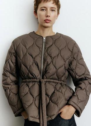 В наявності розміри S,M Легко ватована стьобана нейлонова куртка. Круглий виріз, застібка-блискавка. Вільний крій, трохи занижені плечі, непомітні кишені з боків, на талії шнурок для стягування, що підкреслює силует. З підкладкою.