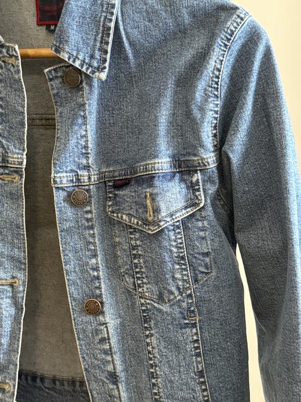 Джинсова куртка у синьому кольорі. Зроблена зі стійкого до зносу деніму. Відмінно підійде для будь-якого образу. ОГ півобхват 46 см Довжина по спинці 49 см Довжина рукава від шва 62 см