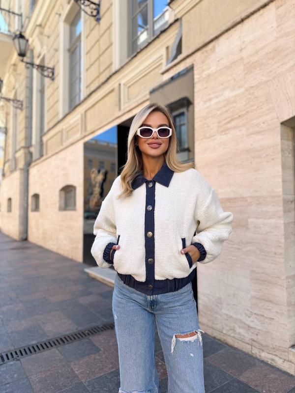 🔥Куртка Тедди 🔥 Модель № 1047 Розміри : 42-44, 46-48 Тканина : турецьке хутро Тедді , джинс , однотонна підкладка Колір : мокко, молочний, бежевий, блакитний Заміри Модель № 1047 42 - 44 / 46 - 48 ОГ - 120 / 126 ОС ( низ гумки ) - 88 ( 104 ) / 98 ( 120 ) в дужках максимально розтягнута гумка Довжина рукава від горловини - 74 / 78 Довжина по спинці- 55 / 58