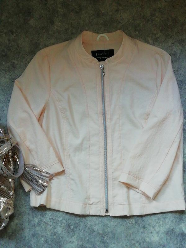 Курточка бомбер Bianca без подклада на блесчатке. Позаду резинка, рукав браслетний. Новая, без бумажной бирки, не одевалась. Ткань очень приятная, 83% вискозы. Цвет - нежно-персиковый, оригинальный. Замеры: длина 57, ПОГ 50, плечи 41, рука 45
