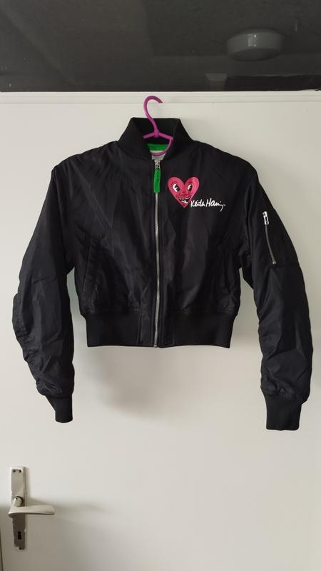 Продам очень стильную и яркую куртку-бомбер H&M из лимитированной коллекции, созданной в коллаборации с легендарным американским художником Keith Haring. Эта куртка станет настоящей находкой для любителей уличного стиля и оригинальных вещей! Главные особенности: Коллаборация: H&M x Keith Haring (уникальный и известный принт). Дизайн: Укороченный (кроп) фасон, который отлично сочетается с джинсами с высокой посадкой, брюками-карго или платьем. Цвет: классический черный нейлон снаружи. Яркая, эффектная неоново-зеленая подкладка (можно носить навес для WOW-эффекта!). Принти: Спереди: Розовое сердце с надписью Keith Haring. Сзади: Большое крылатое сердце в неоново-зеленом цвете. Размер: Куртка идет подростковой/юниорской сеткой, но отлично садится на женский размер XS или S. Размер из бирки: EUR 152, US 14 (10-15 лет). Фактический размер женский: XS-S (смотрите фото на модели). Состояние и детали Состояние: отличное, без дефектов. Материал: 100% полиэстер (верх и подклад). Производство: Бангладеш.