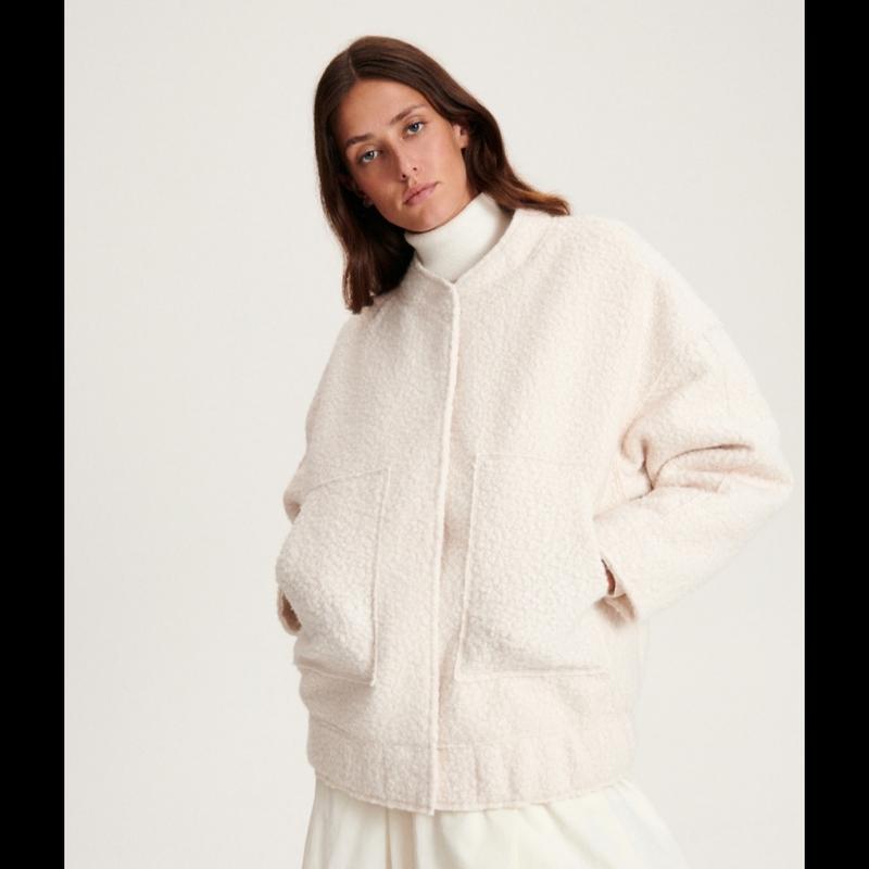 Куртка із штучної овчини Куртка-бомбер від RESERVED крою оверсайз, зі штучної овчини. -Низький комір-стійка -довгі рукави -занижена лінія плечей -кріплення прес-шпилькою під накладкою -дві великі прорізні кишені спереду -регульований поділ Заміри: Довжина 72 см Довжина рукава 62 см НОГ 63 см По низу 57/63 см