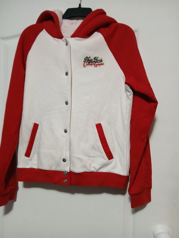 Да, это красно-белый бомбер (или куртка в стиле varsity/letterman) с капюшоном, украшен надписью "New York College League". Стиль: Это куртка-бомбер или куртка в университетском (varsity) стиле, имитирующая традиционную одежду студентов американских колледжей и спортсменов. Дизайн: Она имеет контрастные красные рукава и капюшон с белой основной частью. Обычно такие куртки имеют застежки-кнопки и карманы. Надпись: Вышивка "New York College League" указывает на принадлежность к вымышленной или общей спортивной тематике, распространенной на одежде в таком стиле.