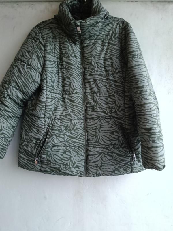 Стильная и теплая курточка. Интересный принт, комбинация зеленого и оливкового цвета. Рукава на резинке. Есть капюшон который прячется в воротник. Фасон ровный. На талии есть кулиса. Покупала новой, носила 1 сезон. Размер 16. Замеры: рукава 62 см, пог 58, пот 57, поб 58 см.